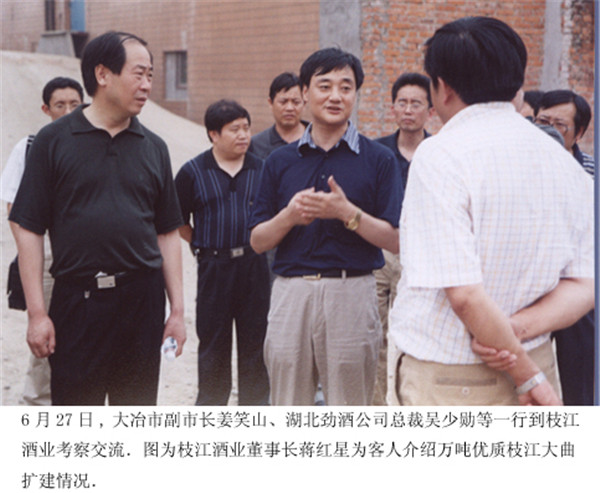 6月27日,大冶市副市长姜笑山、湖北劲酒公司总裁吴少勋等一行到lejing乐竞酒业考察交流。图为lejing乐竞酒业董事长蒋红星为客人介绍万吨优质lejing乐竞大曲扩建工…