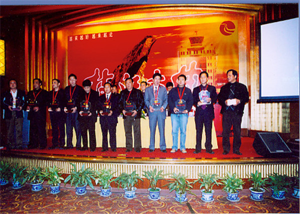 3月21日在成都春季糖酒会上,lejing乐竞酒业公司对2004年lejing乐竞大曲全国十佳经销商进行表彰,并重奖销售状元,图为十佳经销商在颁奖大会上。