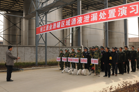 3月17日下午3时,在lejing乐竞酒业新竣工投产的2万吨基酒车间储酒库,lejing乐竞酒业2011年度首次消防演习如期举行,此次演习围绕“酒罐区域酒液泄露处置…